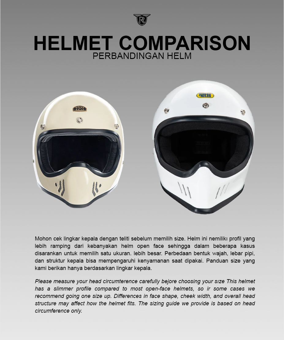 Helm dengan format full face yang terinspirasi dari desain helm trail di tahun 80-an namun tetap dipadukan dengan elemen-elemen yang relevan untuk zaman sekarang. Dibuat dengan kualitas fiber terbaik dan bagian interior yang dipilih untuk memberikan kenyamanan untuk pengguna motor.